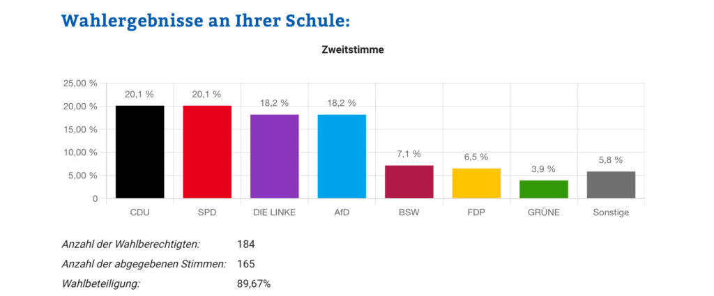 Im Vorfeld der Wahl beschäftigten sich die Klassen im Unterricht mit dem deutschen Wahlsystem, den Aufgaben der Parteien sowie aktuellen politischen Themen. Ziel war es, den Schülerinnen und Schülern die Bedeutung von Wahlen und politischer Mitbestimmung näherzubringen.